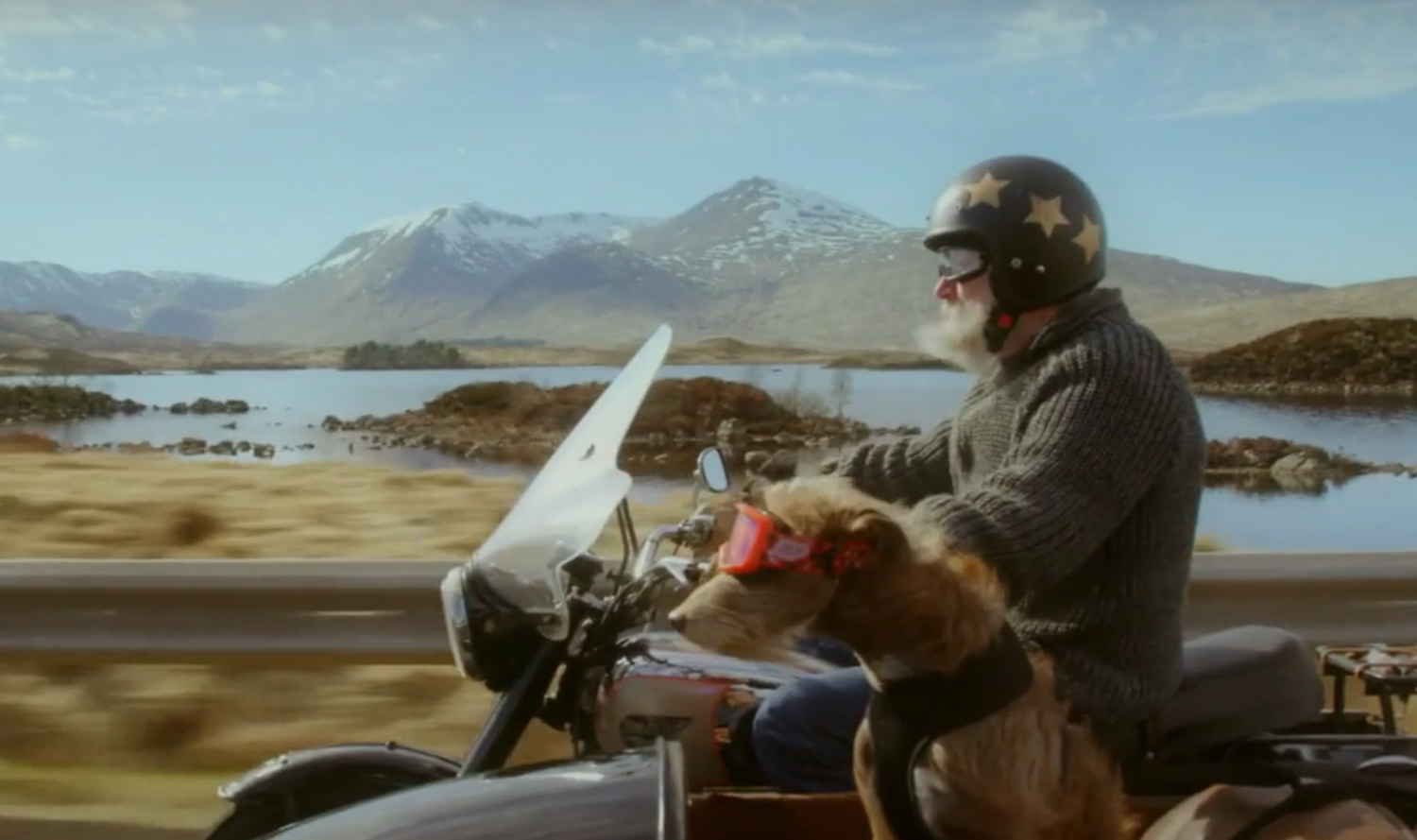 How to describe the experience of new Dairy Milk Big Taste? A dog wearing ski goggles riding in a sidecar through breathtaking Scottish scenery.